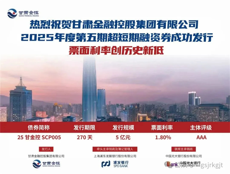 2025年11月17日,甘肅金控集團(tuán)成功發(fā)行2025年度第五期超短期融資券,發(fā)行規(guī)模5億元,期限270天,票面利率1.8%,創(chuàng)下集團(tuán)自開展債券融資業(yè)務(wù)以來(lái)所有債券品類中的歷史最低利率紀(jì)錄,融資成本管控成效顯著。此次低利率超短期融資券的成功發(fā)行,體現(xiàn)了資本市場(chǎng)對(duì)甘肅金控集團(tuán)經(jīng)營(yíng)實(shí)力、信用資質(zhì)及發(fā)展前景的高度認(rèn)可,為其后續(xù)支持省內(nèi)實(shí)體經(jīng)濟(jì)發(fā)展、深化金融服務(wù)創(chuàng)新、防范化解金融風(fēng)險(xiǎn)等工作提供更充足的資金保障,助力集團(tuán)在服務(wù)全省經(jīng)濟(jì)社會(huì)高質(zhì)量發(fā)展中發(fā)揮更大作用。